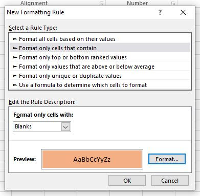 * Pada bagian Edit Rule Description : Format Only Cells With : BLANKS
