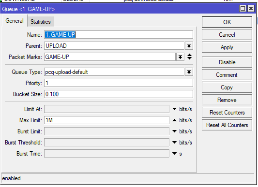 add name=”1. GAME-UP” packet-mark=GAME-UP parent=UPLOAD priority=1 queue=pcq-upload-default