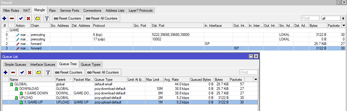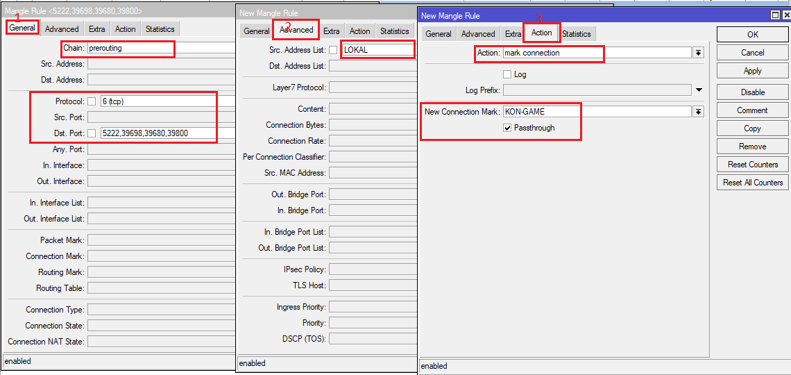 ip firewall mangleadd action=mark-connection chain=prerouting comment=GAME dst-port=5222,39698,39680,39800 new-connection-mark=KON-GAME passthrough=yes protocol=tcp src-address-list=LOKAL