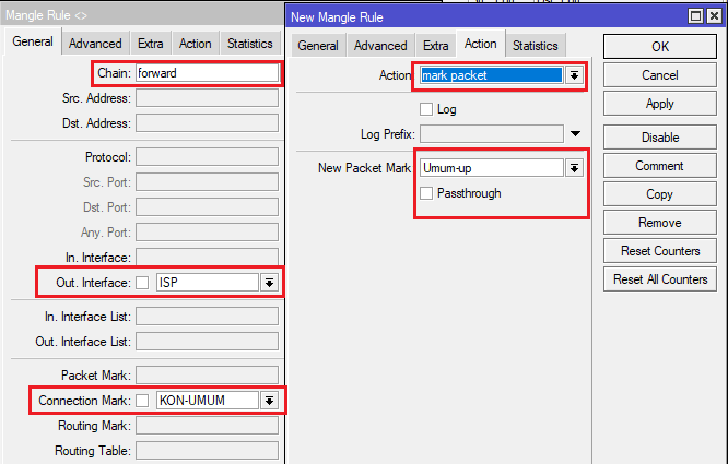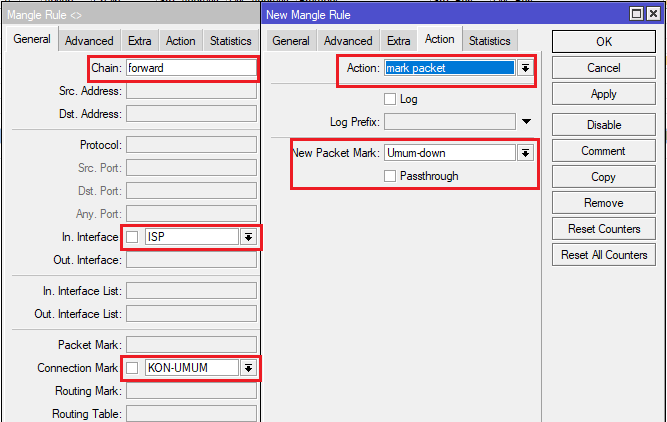 ip firewall mangle add action=mark-packet chain=forward connection-mark=KON-UMUM new-packet-mark=Umum-up out-interface=ISP passthrough=no