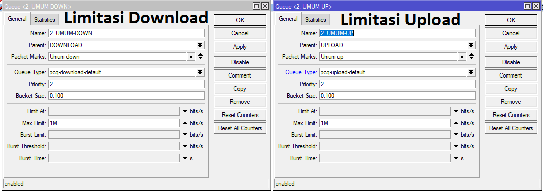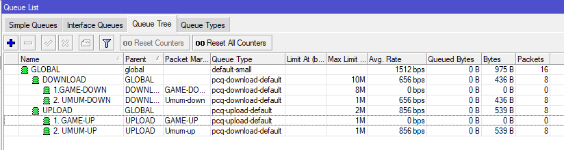 queue tree add max-limit=1M name=”2. UMUM-UP” packet-mark=Umum-up parent=UPLOAD priority=2 queue=pcq-download-default