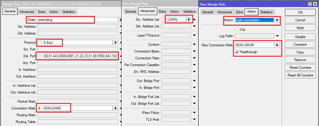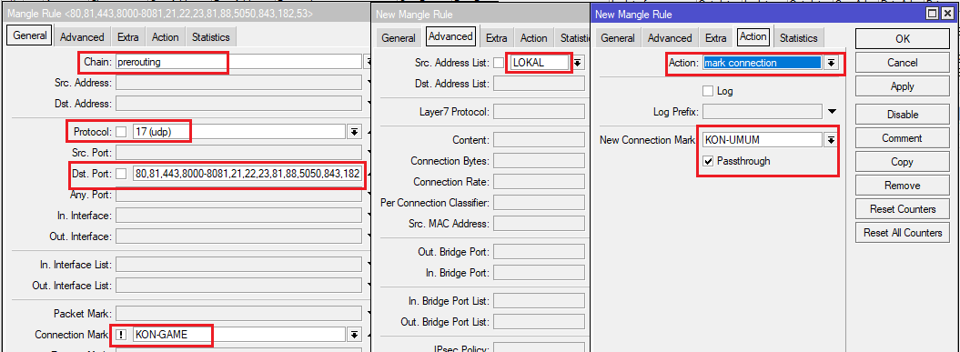 ip firewall mangle add action=mark-connection chain=prerouting comment=”TRAFIK UMUM” connection-mark=!KON-GAME dst-port=80,81,443,8000-8081,21,22,23,81,88,5050,843,182,53 new-connection-mark= KON-UMUM passthrough=yes protocol=tcp src-address-list=LOKAL