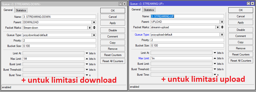 sesuaikan max limit atau kecepatan download dan upload khusus untuk trafik streaming. sesuaikan “packet mark” dengan paket download/upload yang sudah dibuat di firewall mangle. Untuk “Parent” itu sudah saya buat sebelumnya pada artikel sebelumnya. maka hasilnya akan seperti ini: