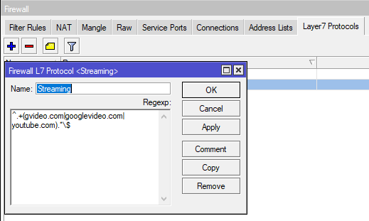 ip firewall layer-7-protocol add name=Streaming regepx=^.+(gvideo.com|googlevideo.com|youtube.com).*$