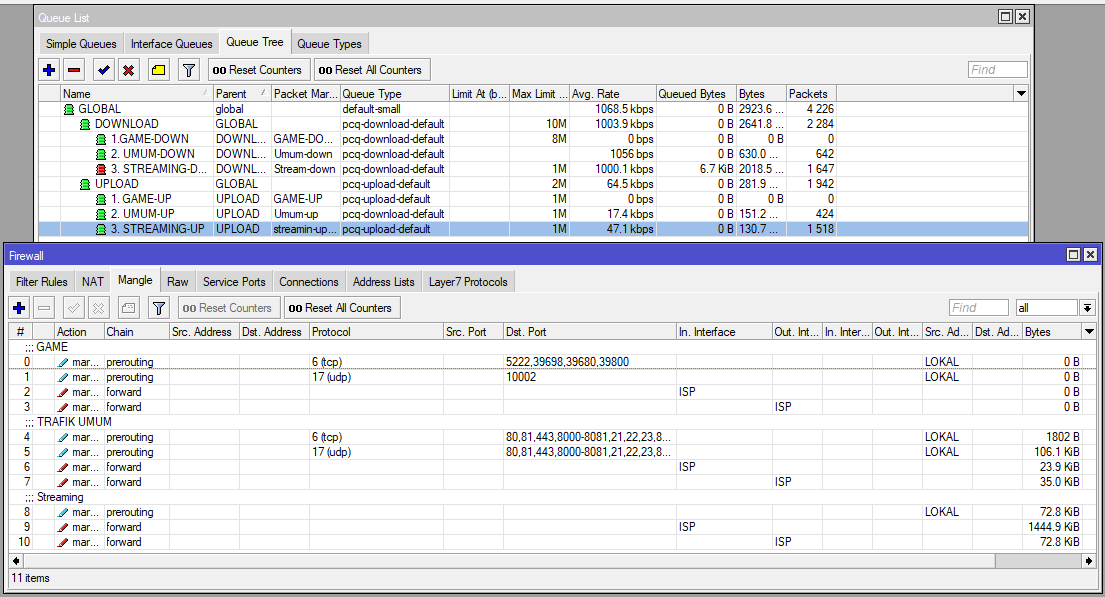 Cara diatas bisa langsung dipraktekan, yaang membedakanya adalah pada queue tree saya sambungkan dengan artikel sebelumnya tentang pisah trafik sehingga muncul parent-parent lain. agar lebih jelasnya silahkan baca arikel yang bersangkutan: