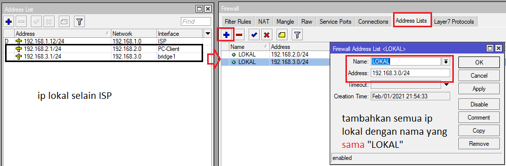 gunakan. Caranya masuk menu “ip—firewall—address list—add”