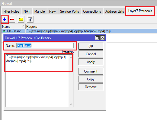 ip firewall layer7-protocol add name=File-Besar=”^.+(exe|rar|iso|zip|7z|flv|mkv|avi|mp4|3gp|mp3|dat|mov|.mp4).*$”