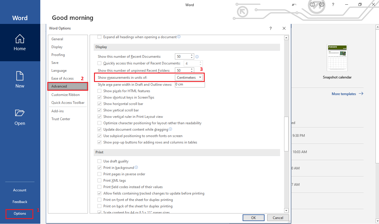 - scroll kebawah dan pada bagian “show measurements in units of;” Ganti setelan “Inches” menjadi “Centimeters”