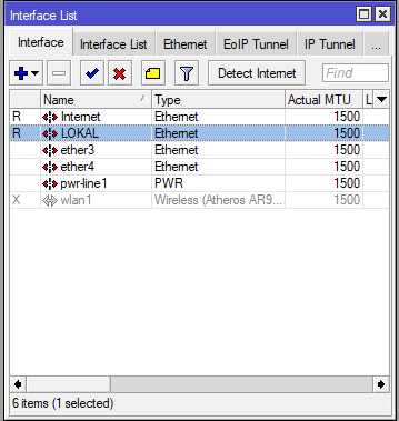 - ether2 akan kita gunakan sebagai jaringan lokal dimana interface tersebut yang kita gunakan sebagai meremote mikrotik. Kita akan beri nama “LOKAL”