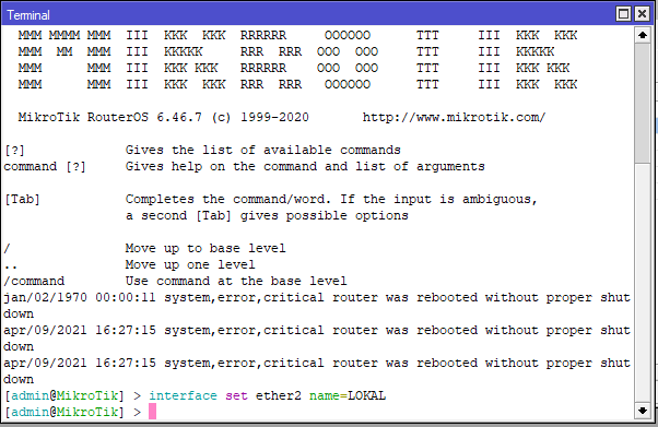 (CLI) kemudian kita akan merubah ether2 menjadi LOKAL dengan menggunakan perintah CLI melulai Terminal di aplikasi winbox, bisa juga menggunakan aplikasi lain seperti telnet, ssh, ataupun terminal lainya. Caranya masuk ke Terminal dan ketikan perintah :