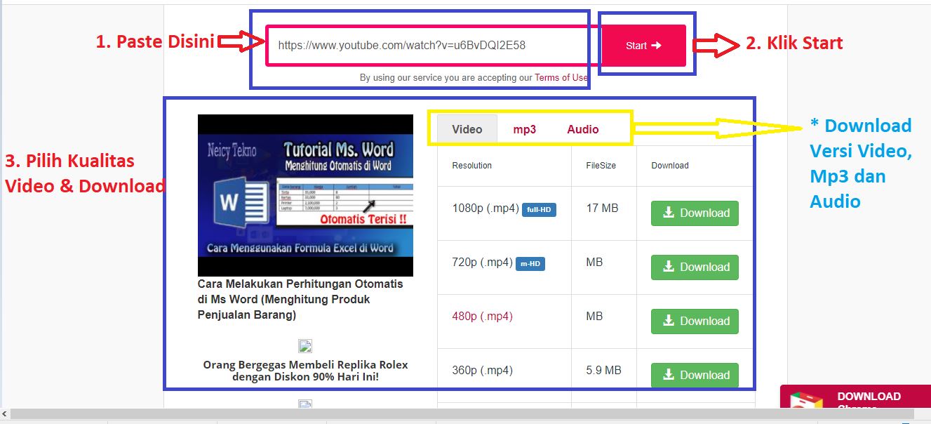 Bagian No. 3: Setelah Itu maka akan muncul Daftar Kualitas dari Video Mp4. Tekan Download.****Di bagian ini kamu bisa Converter Video Youtube To Mp3 (Perhatikan Tanda Panah berwarna Kuning).