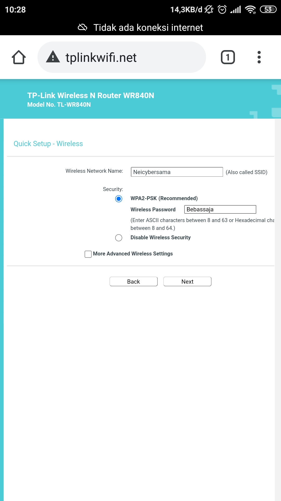 6. Nahh disiini kita sesuaikan SSID/nama wifi dari tp-link beserta dengan password/kata sandi yang akan digunakan. jika sudah sesuai tekan next. dan save.