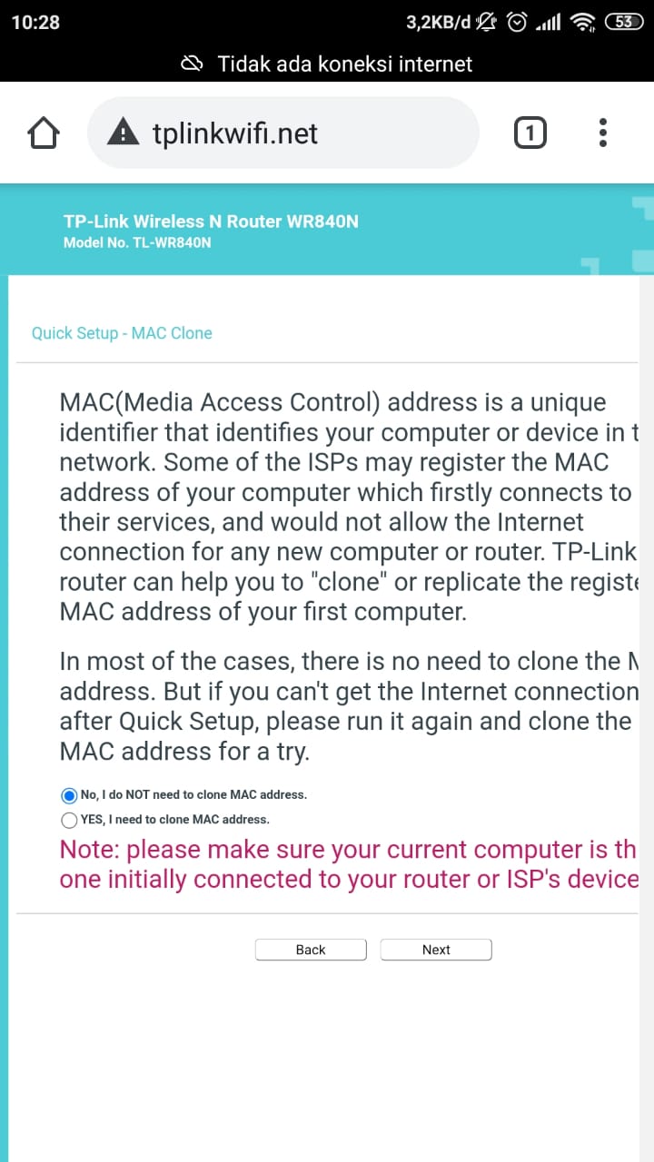 5. disini kita bebas mau merubah mac address atau tidak, pilih no saja jika tidak ingin merubahnya. kemudian tekan next.