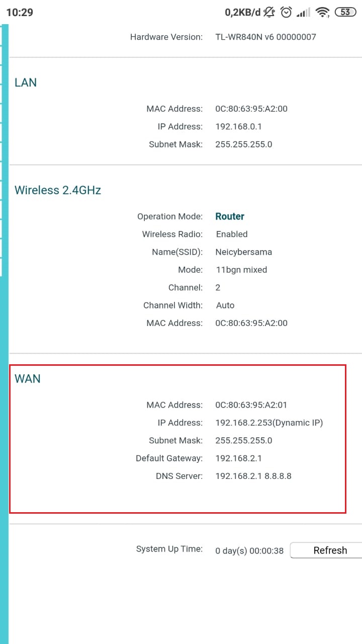 8. Jika berhasil maka, pada tab status akan muncul informasi bahwa WAN/router kita sudah mendapatkan alamat ip dan sudah bisa mengakses internet.