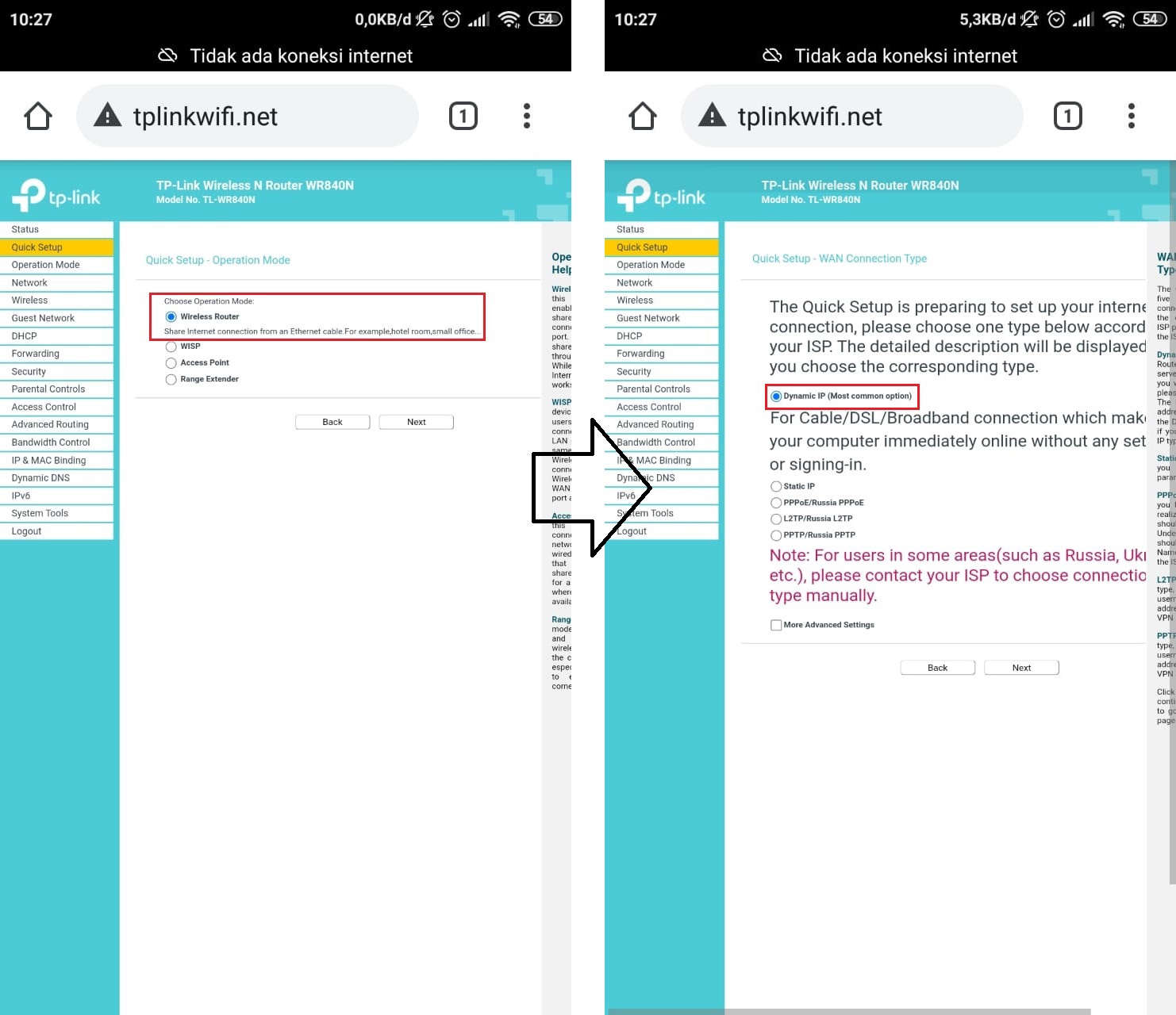 4. kemudian untuk menyetting dhcp, masuk ke menu “Quick setup” kemudian pilih Mode “Wireless Router” dan pilih type “Dynamic IP”