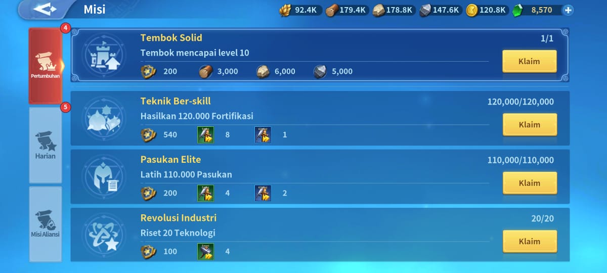 Ada Banyak Misi yang bisa kamu selesaikan untuk mendapatkan berbagai Hadiah Menarik dari Game. Misi Pertumbuhan, Misi harian dan Misi Aliansi Bisa kamu selesaikan dengan sangat mudah. Misi yang dilakukan hanya sebatas meningkatkan, Membangun atau bertarung. Hadiah yang di dapatkan sangat beragam, Dari mulai sumber daya hingga Item Langka. Jadi selesaikan Misi sebaik mungkin.