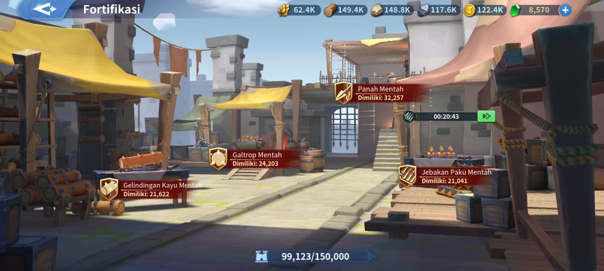 Produksi Jebakan dan peralatan untuk pertahanan benteng. Disana kamu bisa membuat anak panah, Galtrop, gelindingan kayu dan jebakan paku. Nah Produksi Sebanyak mungkin hingga batasnya tercapai.