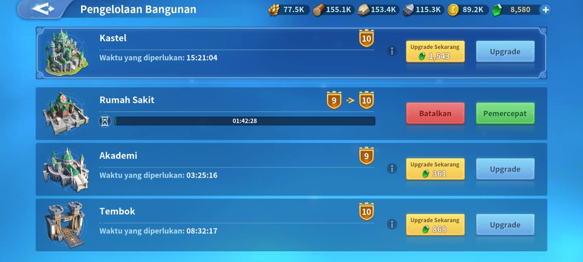 Setelah memilih Kerajaan Impian, Tingkatkan Level Bangunan terlebih dahulu sebelum meningkatkan Level Kastel. Jadi Semua bangunan harus berada di Level MAX, Setelah itu barulah kamu tingkatkan Kastel untuk membuka Level Baru pada setiap bangunan yang ada.