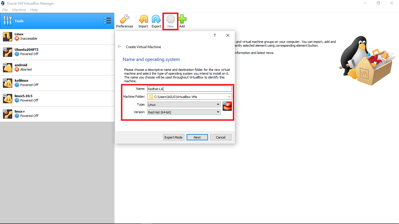 2. kemudian buat machine baru, dengan menekan menu “new” dan sesuaikan nama mesin beserta jenis OS yang diguanakan
