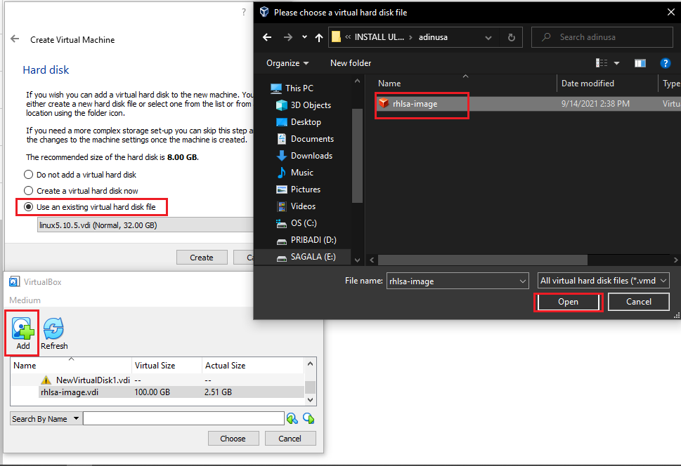 4. Setelah itu pilih “use an exiting virtual hard disk file” dan arahkan/tambahkan(add) file VDI yang akan di install.