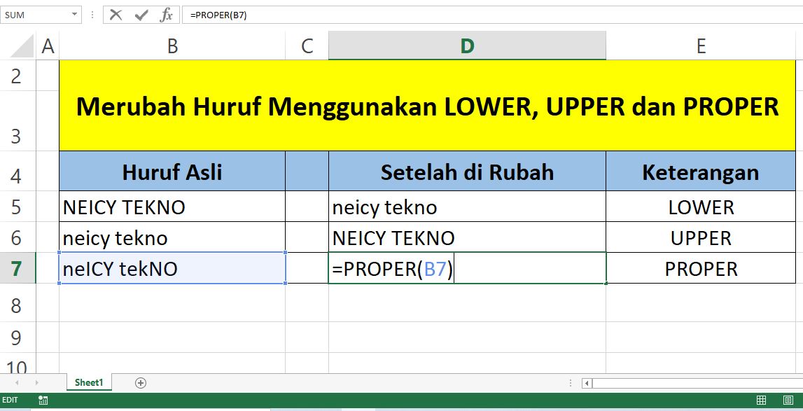– B7 merupakan Cell Huruf asli yang akan dirubah.Selain itu, Kamu juga bisa menggunakan rumus yang lain. Yaitu: