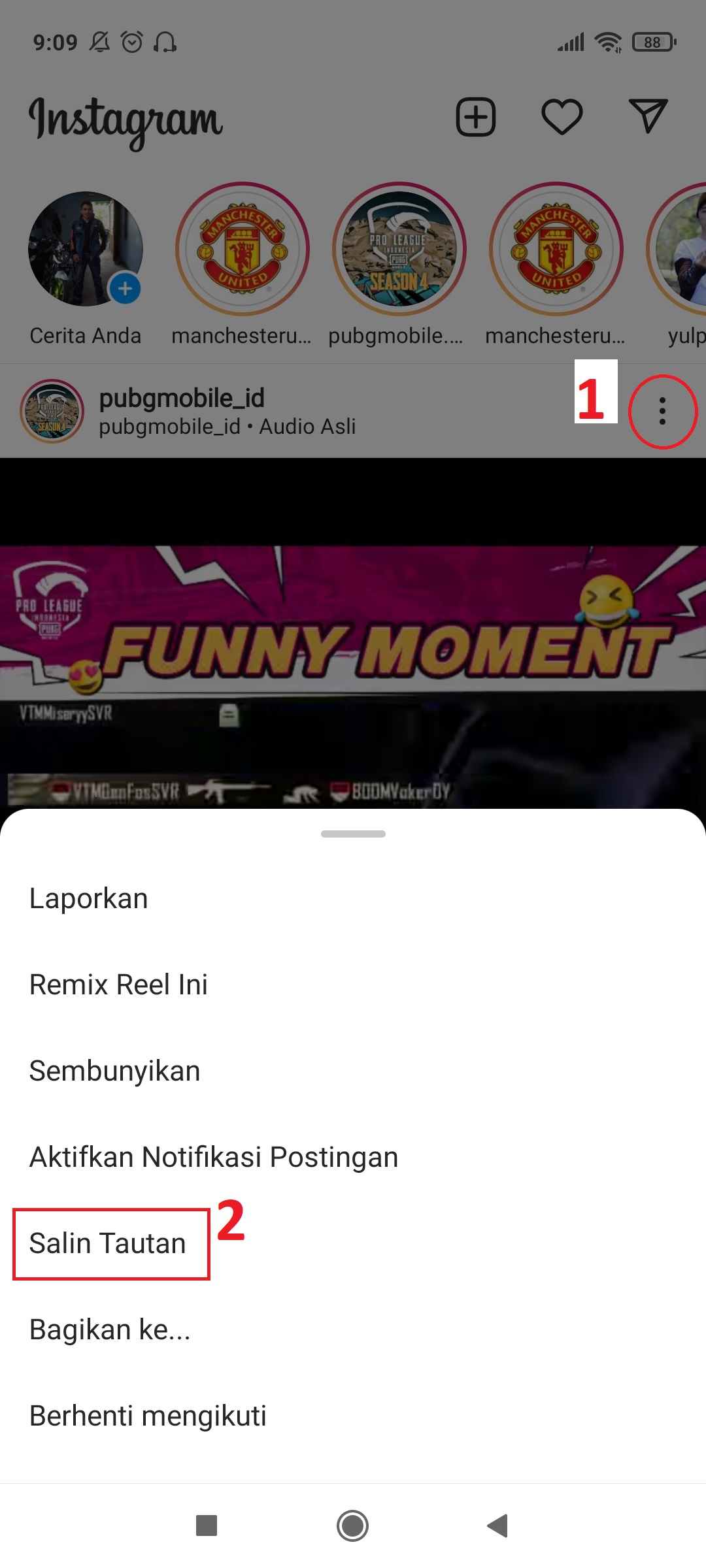 - Kemudian tekan Icon Titik 3 di sebelah kanan atas Video dan Pilih Salin Tautan. Perhatikan Gambar di bawah Ini: