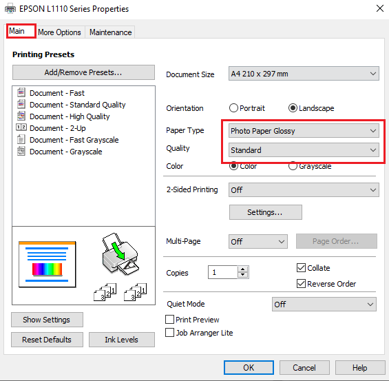 Namun sebelum melakukan printing dokument ataupun Foto pastikan menggunakan kertas, Tinta, dan settingan yang tepat agar kualitas yang didipat akan maksimal. Kertas, jenis tinta yang digunakan dan settingan yang dipilih akan menentukan hasilnya.